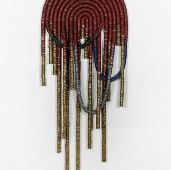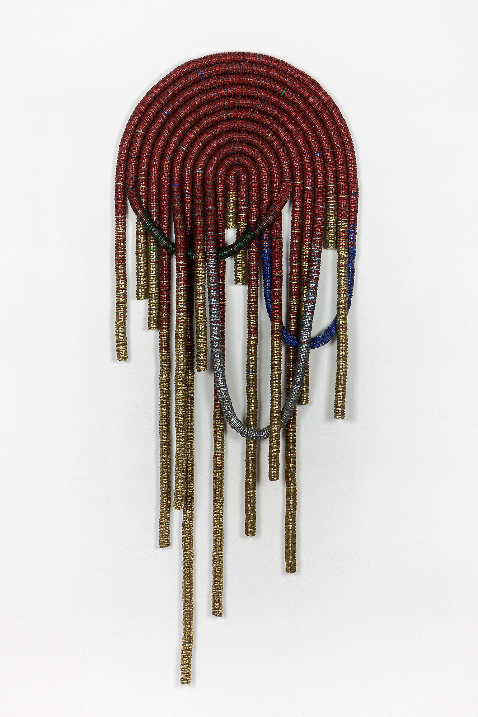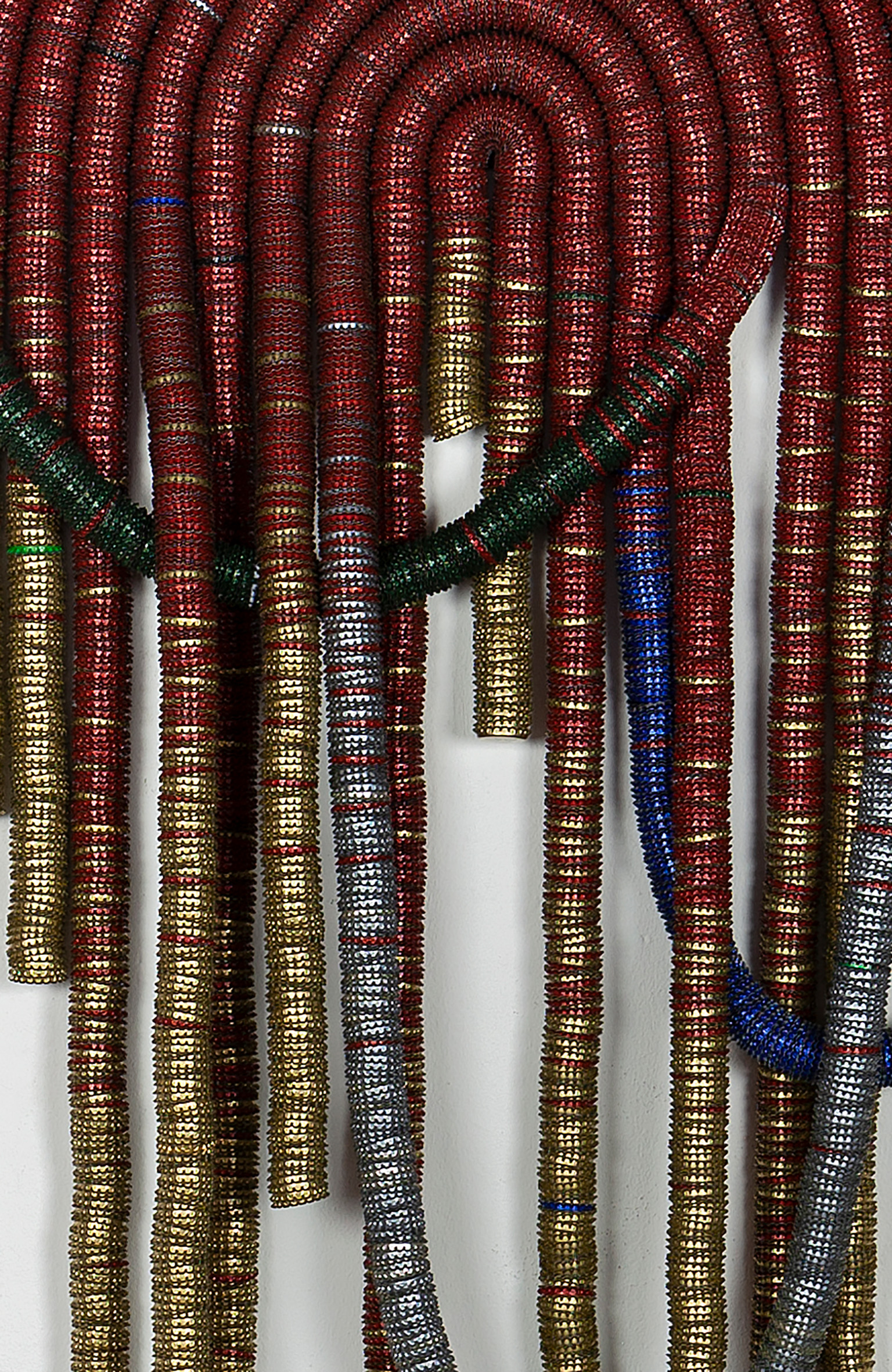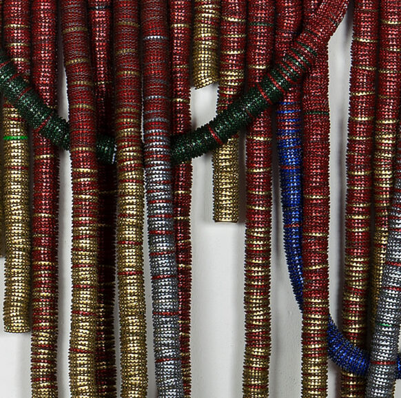 Discarded beer bottle tops threaded onto woven steel rope, held in poly- urethane sealant on timber board