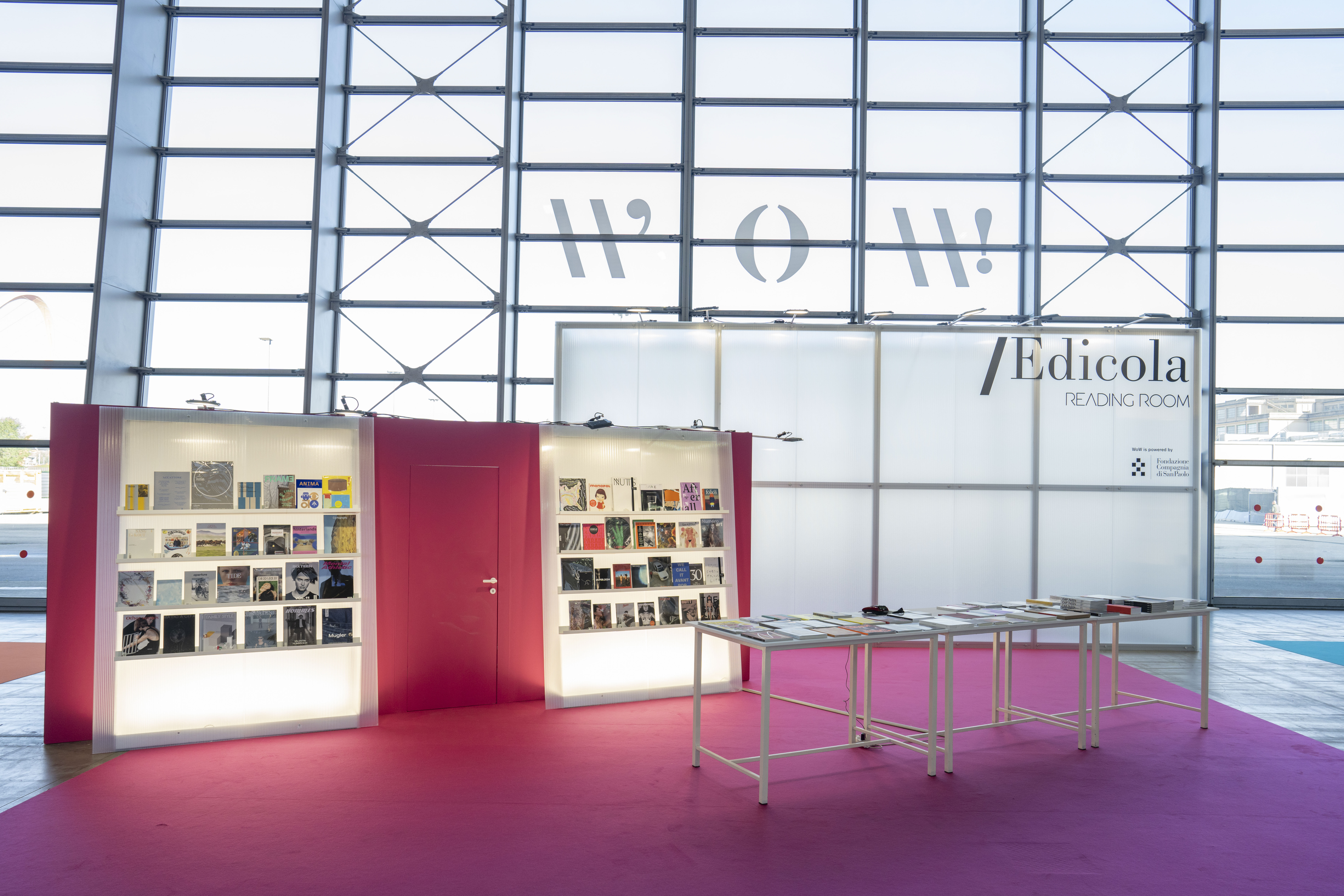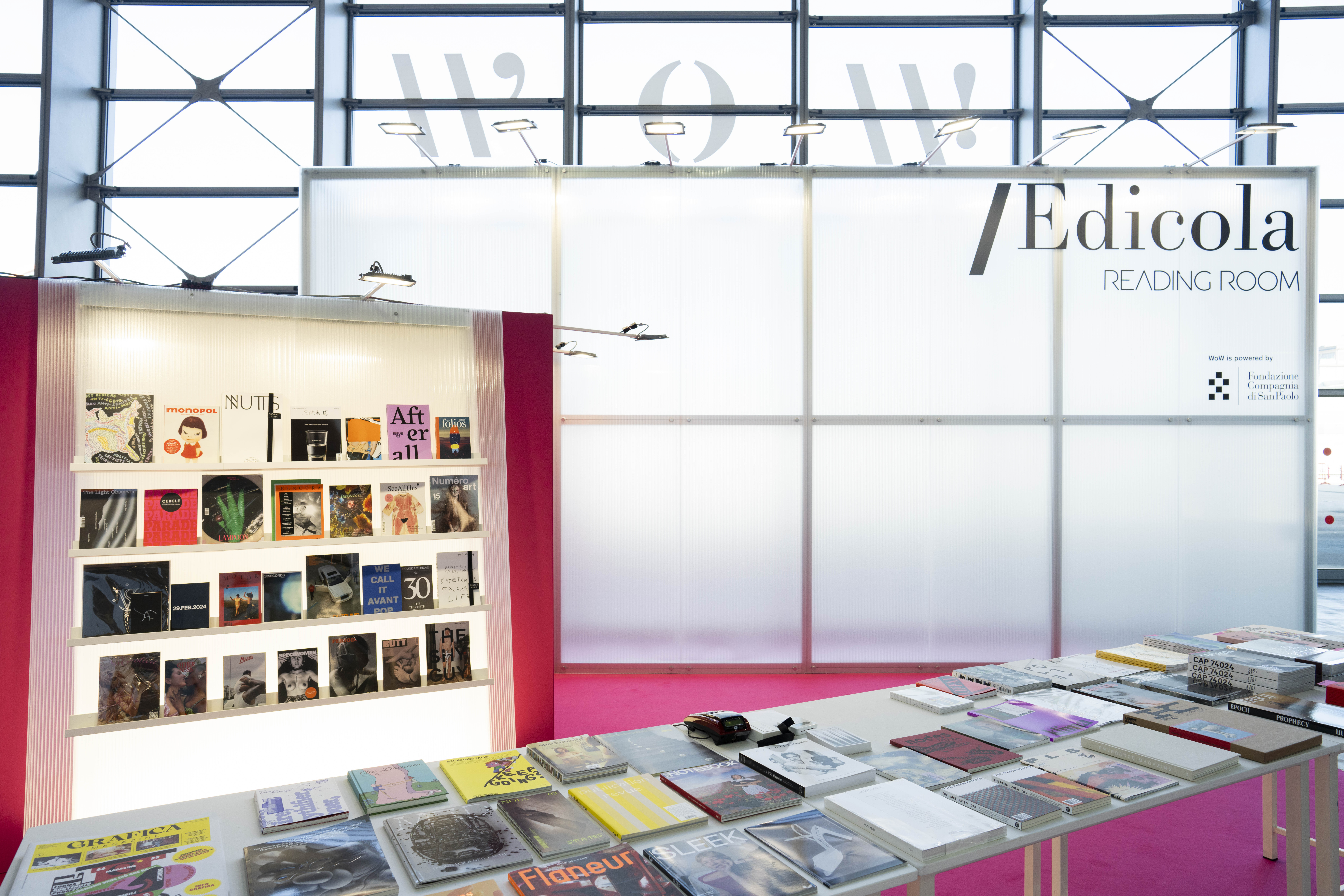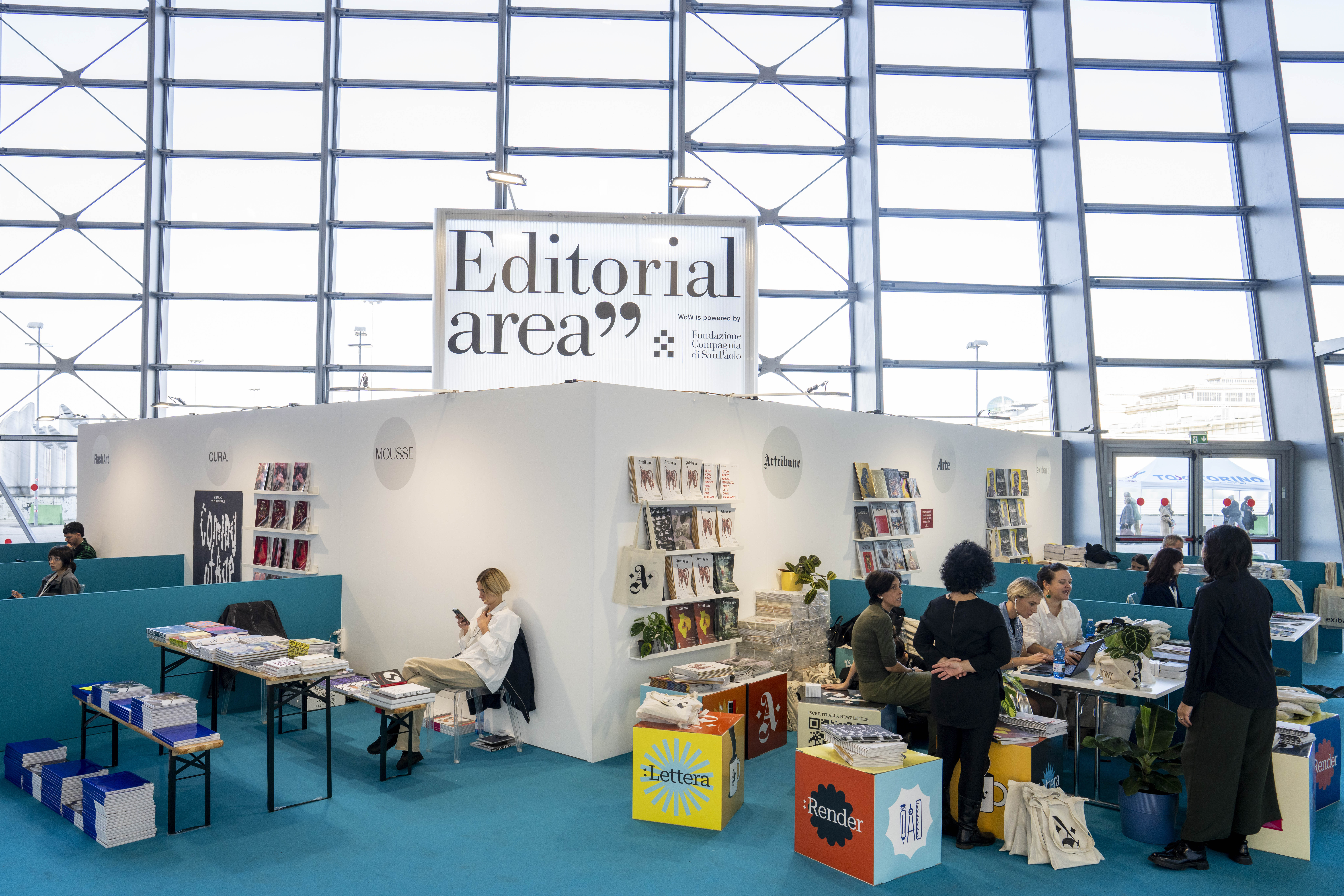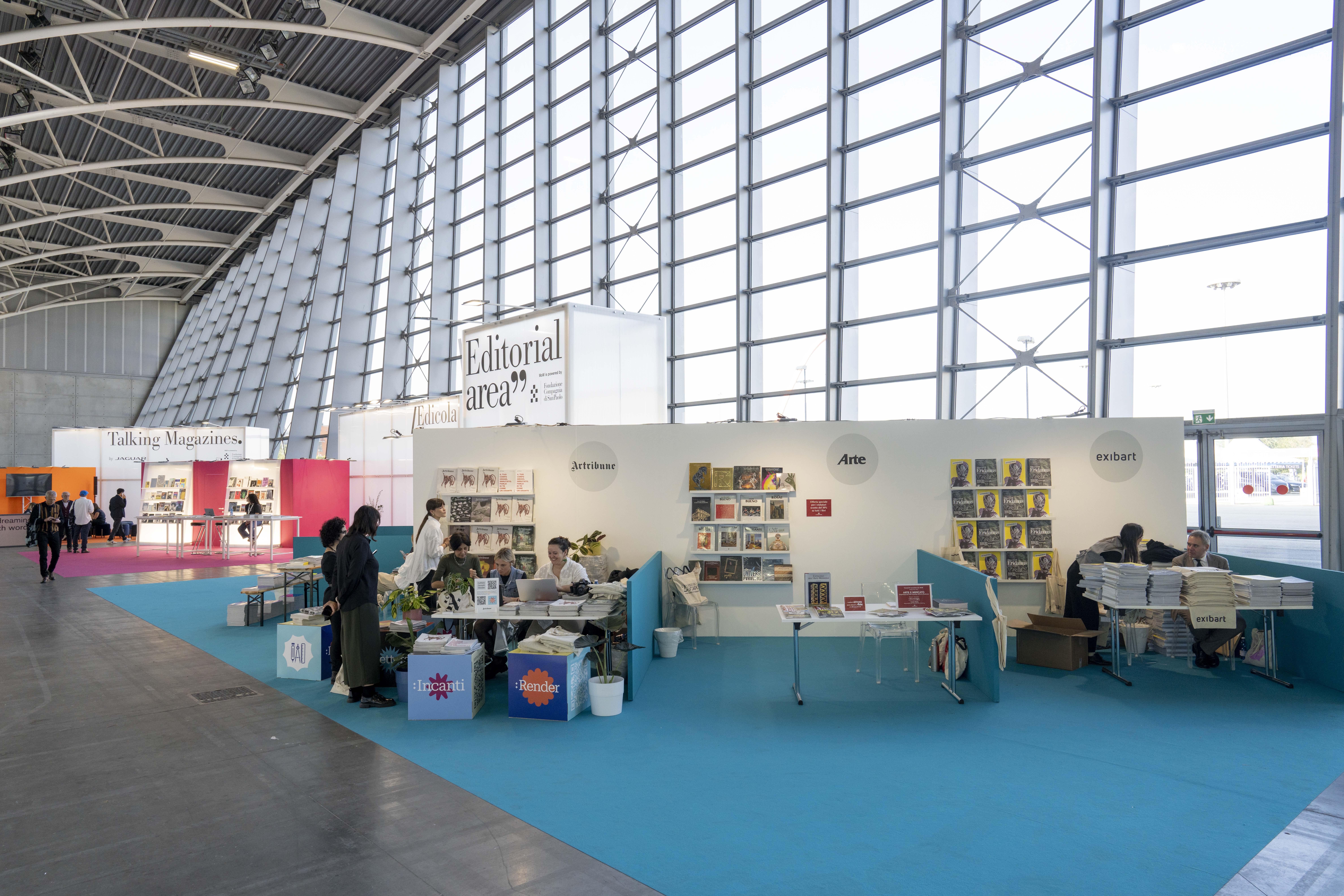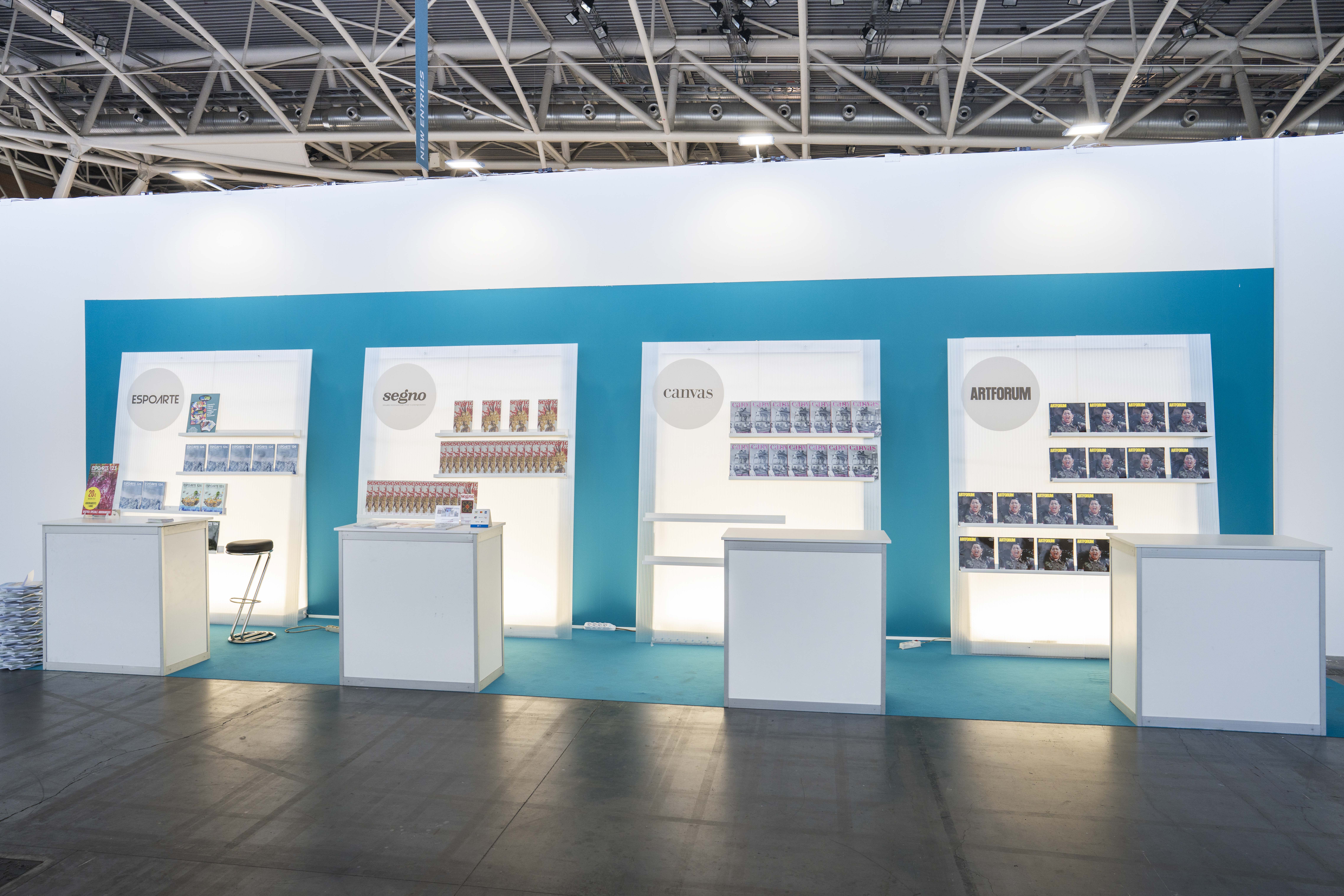 A nucleus of individual booths and single displays designed to maximize visibility for participating magazines and publishers, highlighting their unique characteristics. The magazines featured include: Arte — Cairo, Artforum, Artribune, Canvas, CURA., Espoarte, exibart, Flash Art, INSIDE ART, MOUSSE, and segno.