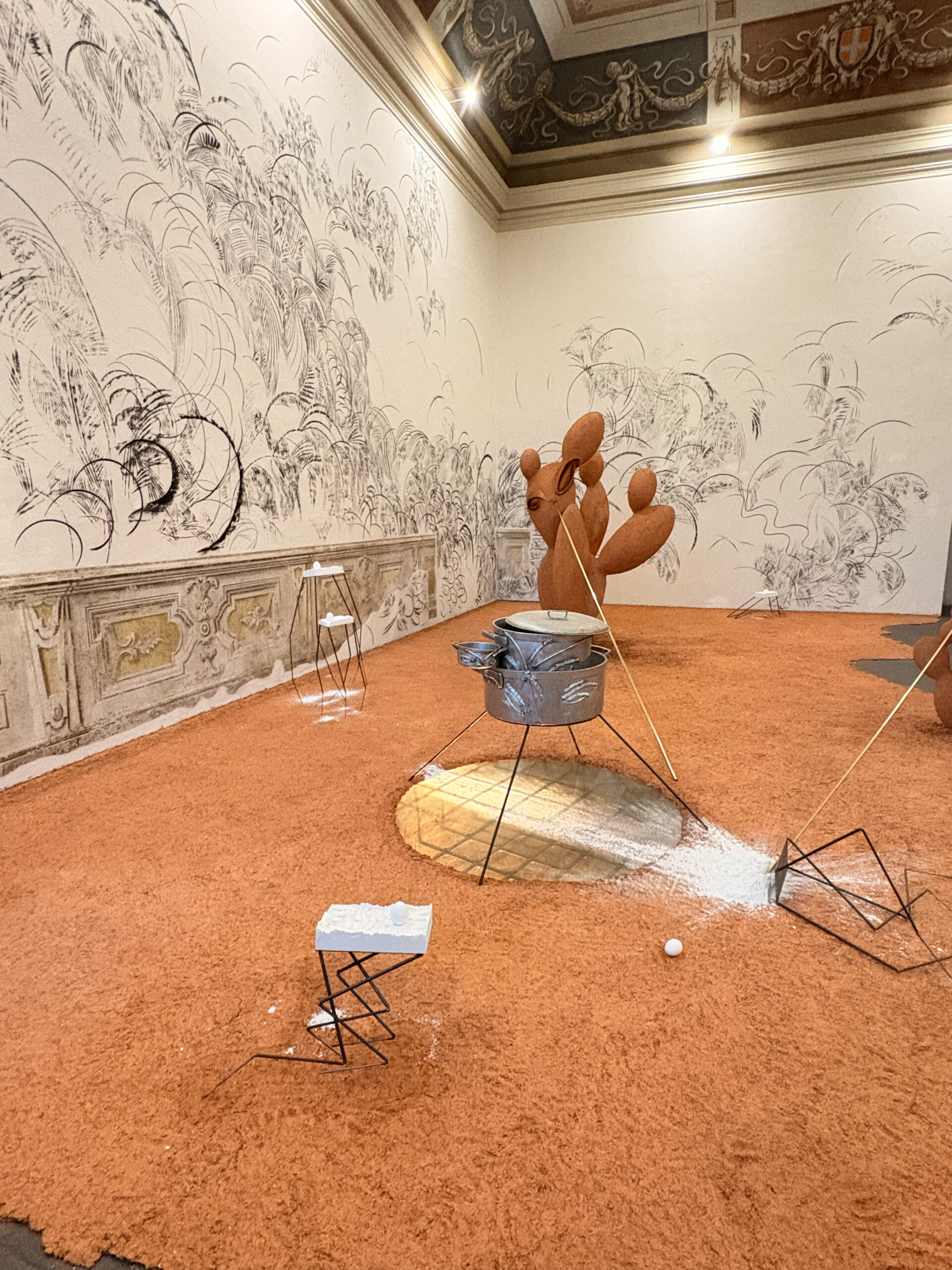 Una sala barocca del Castello di Rivoli Museo d’Arte Contemporanea si trasforma in una possibile selva: sabbia rossa ricopre il pavimento e tracce primordiali affiorano sulle pareti. Attorno all’antico pozzo del castello — convertito in focolare — si dispongono le sembianze di un possibile accampamento: il pozzo diventa fonte di vita e luogo di ritrovo per una comunità improvvisata, ma anche presenza ambigua e potenziale minaccia.